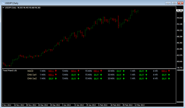 Trend Friend Followダッシュボードインジケータは、1分、5分、15分、30分、1時間および4時間のチャートで売買シグナルを提供する優れたツールです。 2つの指数移動平均(EMA)とMACDインジケータで構成されています。