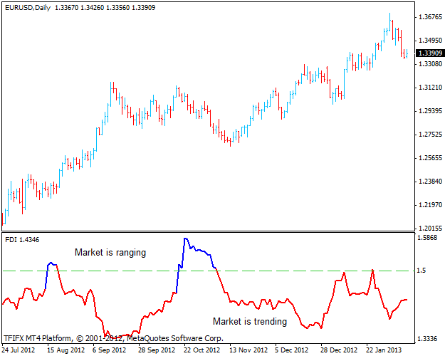 Metatrader 4のFractal Dimensionインジケータは、レンジング市場とトレンド市場の両方を識別します。 1.5を上回る指標値は、(平坦な)市場の範囲を示唆している。 1.5を下回る指標値は、市場のトレンドを示唆している。