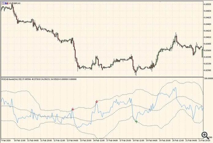 インジケーターは、RSIとそれに基づいて計算されたボリンジャーバンドで構成されます。RSI値がバンド外にあり、バンドに戻ったときにも矢印をプロットします。