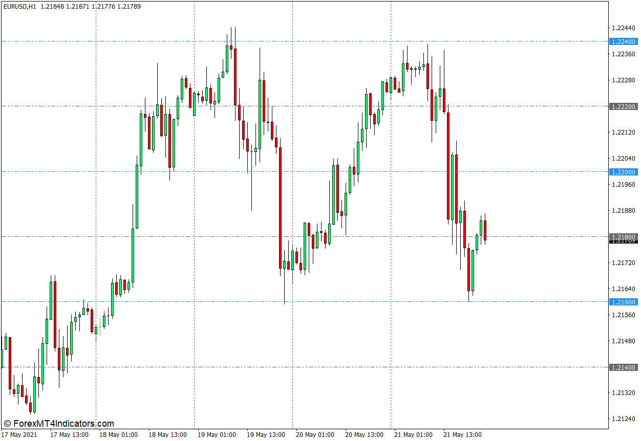 グリッドインジケーターは、水平線と垂直線を単純にプロットする単純なアルゴリズムを使用します。 水平線は、ユーザーが設定したポイント数で区切られた丸い数字に基づいています。 間隔は、インジケーター設定内で変更できます。 ただし、ゼロのまま変更しない場合、インジケーターは価格チャートで利用可能なラウンド数に基づいて間隔をプロットします。