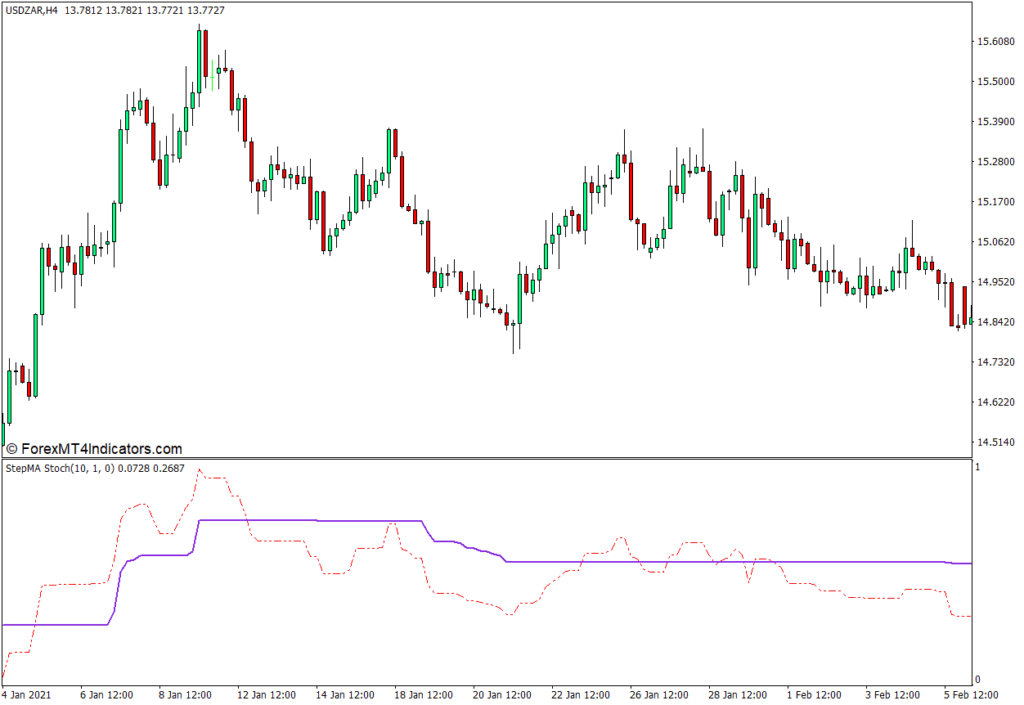 このインジケーターは、0から1の範囲内で振動する2本の線をプロットします。 ステップMAのメインラインは、赤い一点鎖線です。 次に、青紫色の信号線とペアになります。
