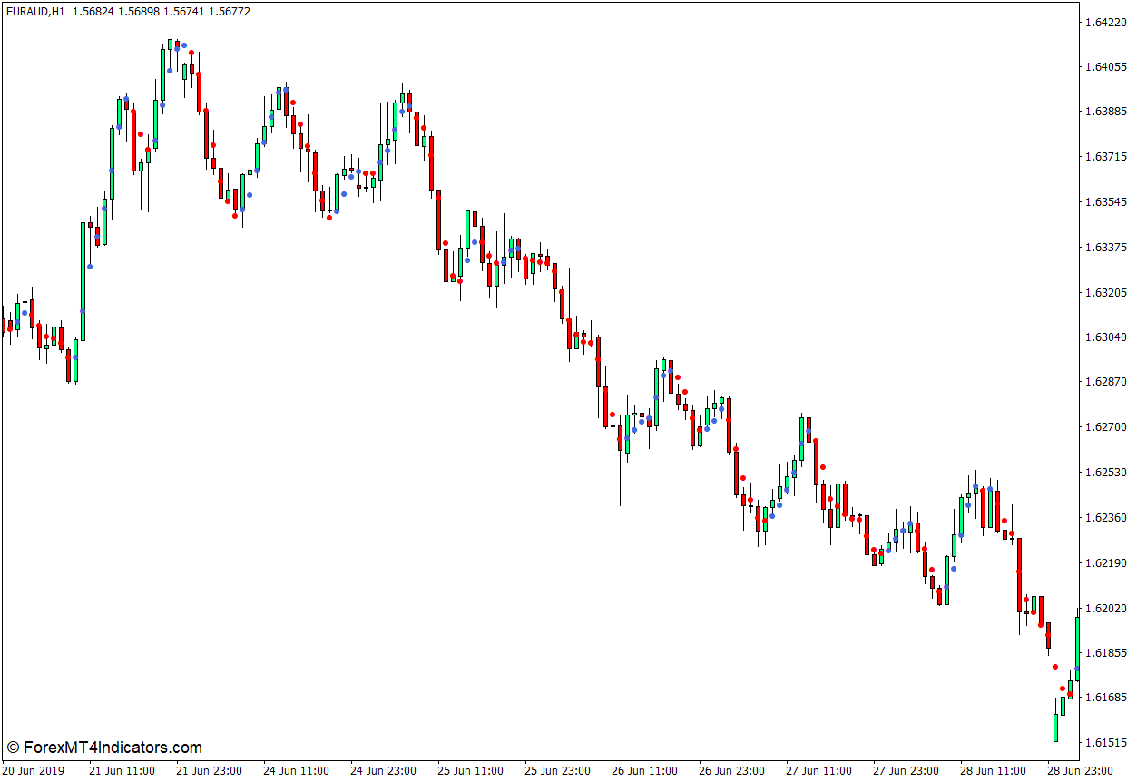 値下げアクションに基づいて下降トレンド市場を特定します。価格が引き戻され、ドットが一時的に青に変わるのを待ちます。ドットが赤に戻ったらすぐに売り注文を開きます。エントリーキャンドルの上の抵抗にストップロスを設定します。