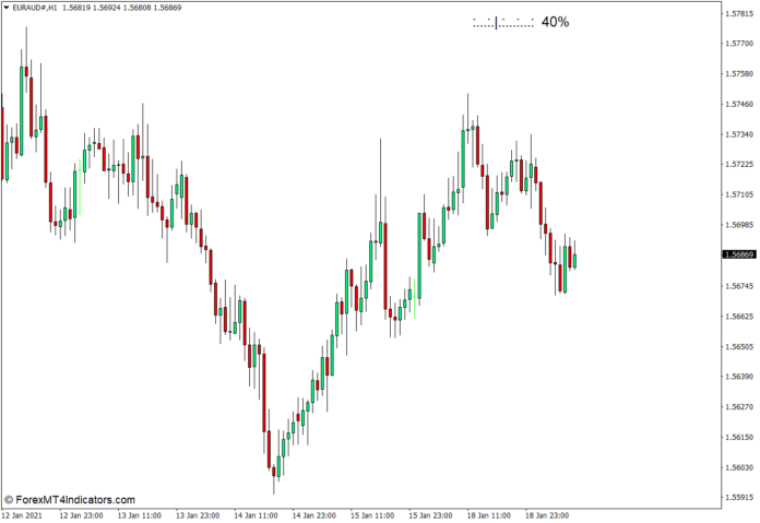バータイマーインジケーターは、ブローカーのサーバーからのタイムフィードを使用して機能します。次に、使用されている時間枠に応じて、現在の時刻とキャンドルが閉じる残りの時刻を比較します。次に、これはパーセンテージ形式に変換され、グラフに表示されます。