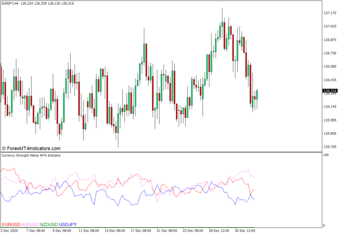 通貨強度メーターインジケーターは、トレーダーに特定の通貨ペアの強さを示すカスタムテクニカルインジケーターです。このインジケーターテンプレートで事前設定されている通貨ペアはすべて米ドル(USD)とペアになっています。これは、この設定により、トレーダーが米ドルに対する動きに基づいて4つの通貨を比較できることを意味します。