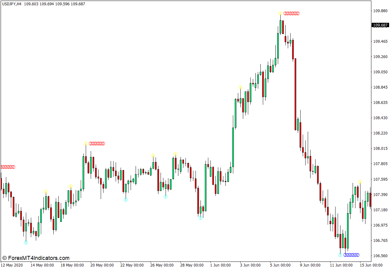 このインジケーターは、スイングの高値と低値を自動的に識別し、スイングの高値と低値に、基になっている時間枠に基づいた番号を付けます。スイングポイントが現在の時間枠に基づいている場合は「1」、スイングポイントが1時間の時間枠に基づいている場合は「2」、スイングポイントが4時間の時間枠に基づいている場合は「3」をプロットします。