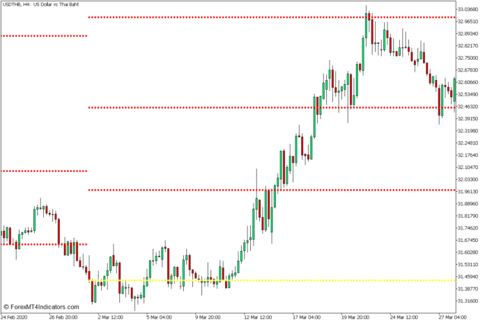 このバージョンのピボットポイントインジケータでは、メインのピボットポイントラインは黄色の点線で示されます。
